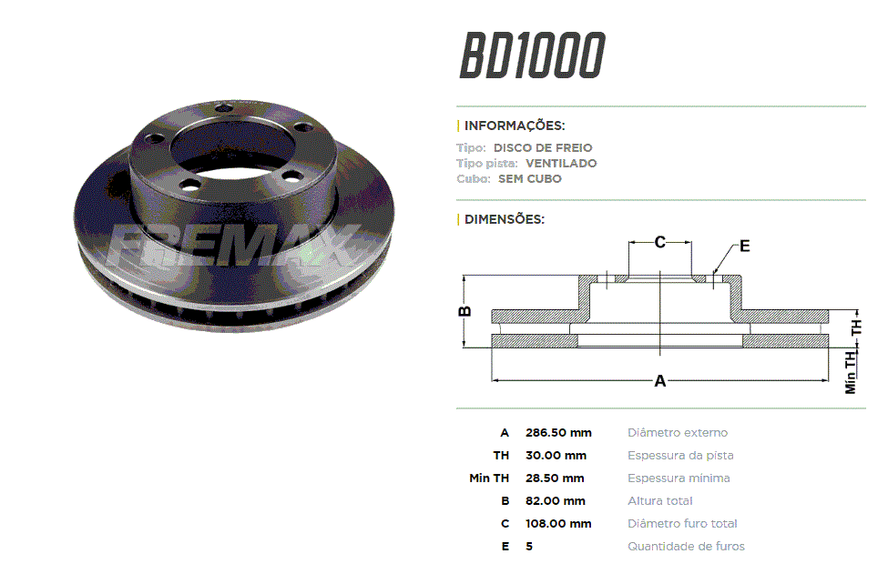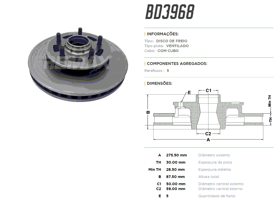 11910 - DISCO FREIO DIANT FORD F1000 2.5/3.6/3.9/4.9 92/... VENTILADO 5-FUROS