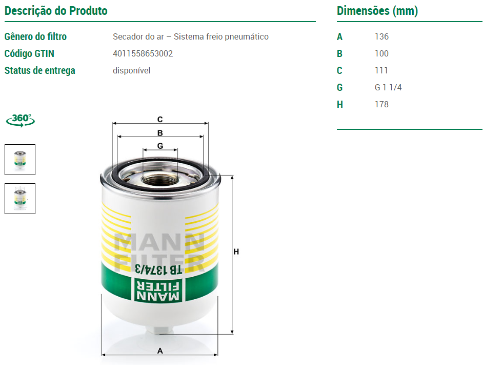 23985 - FILTRO REFIL SECADOR APU WABCO VOLVO/SCANIA 4 1.1/4" ROSCA GROSSA
