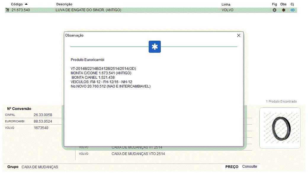 28227 - CONE SINCRONIZADOR CAMBIO VOLVO SR1700/SR1900/VT2014B/VT2214B/VT2514 ANTIGO