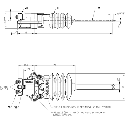 28821 - VALVULA NIVELADORA SUSPENSAO CABINE VOLVO FH/FM/IVECO HASTE FURADA