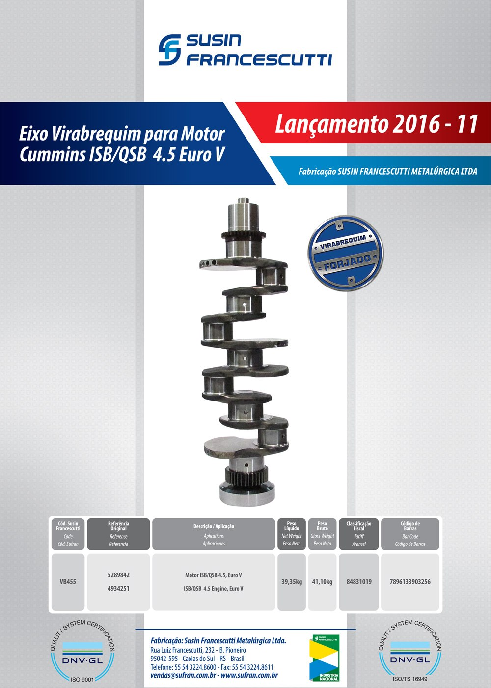 41815 - VIRABREQUIM FORD CARGO/VW CUMMINS SERIE B ISB ISBE QSB 4-CIL 4.5L EURO 5
