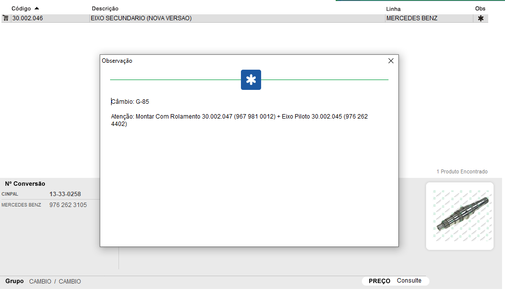 44823 - KITS EIXO PILOTO CAMBIO MB G 85 NOVA VERSAO C/ ROLAMENTO