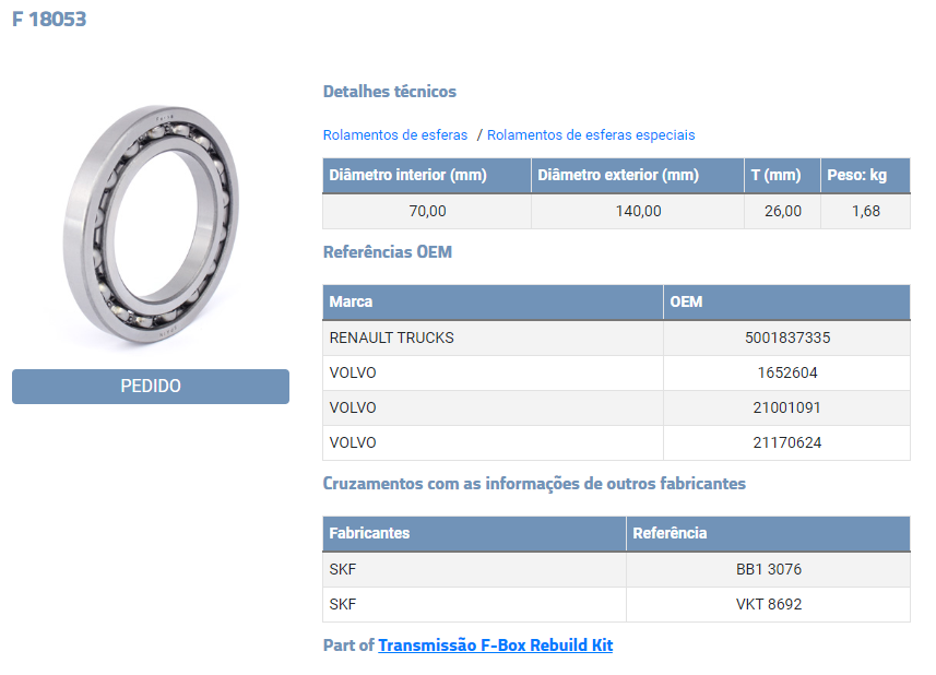10248 - ROLAMENTO EIXO PESADA CAMBIO VOLVO I-SHIFT AT2412C AT2512C AT2812C ATO2512C ATO3112C CAMBIO VOLVO FH/FM