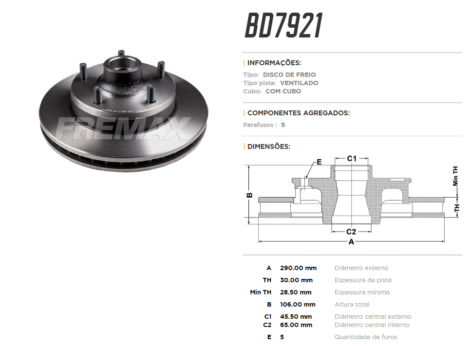 11910 - DISCO FREIO DIANT FORD F1000 2.5/3.6/3.9/4.9 92/... VENTILADO 5-FUROS