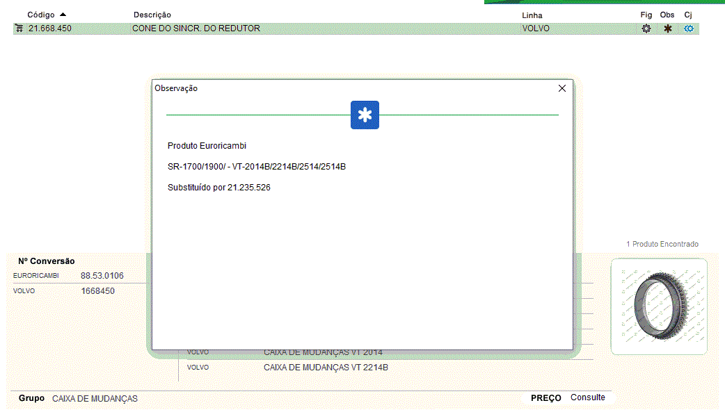 28227 - CONE SINCRONIZADOR CAMBIO VOLVO SR1700/SR1900/VT2014B/VT2214B/VT2514 ANTIGO