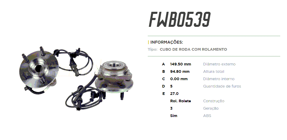 34325 - CUBO RODA DIANT C/ ROLAM FORD RANGER 2.3/2.5/2.8/3.0/4.0 95/12 C/ ABS 5-FUROS