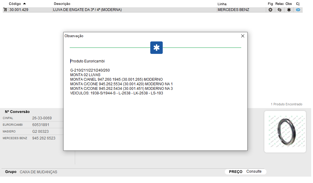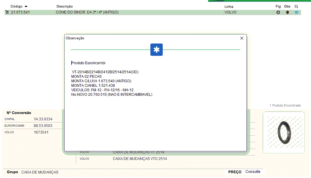 35847 - CONE SINCRONIZADOR CAMBIO VOLVO SR1700/SR1900/VT2014B/VT2214B/VT2514 ANTIGO