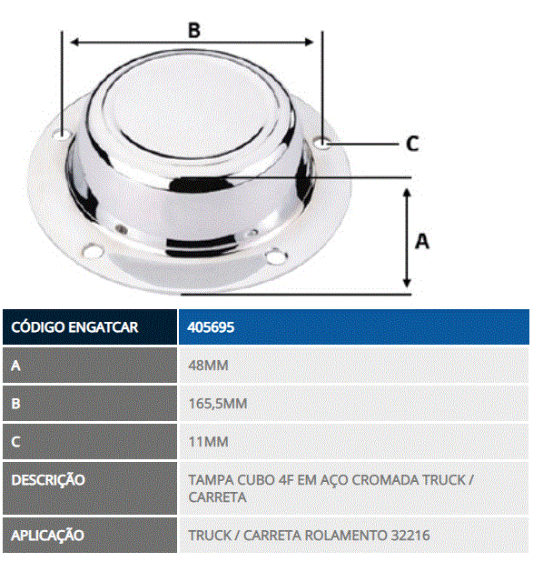 45792 - TAMPA CUBO 4-FURO CARRETA MASTER S/ LOGO 48X165,5X11MM CROMADA